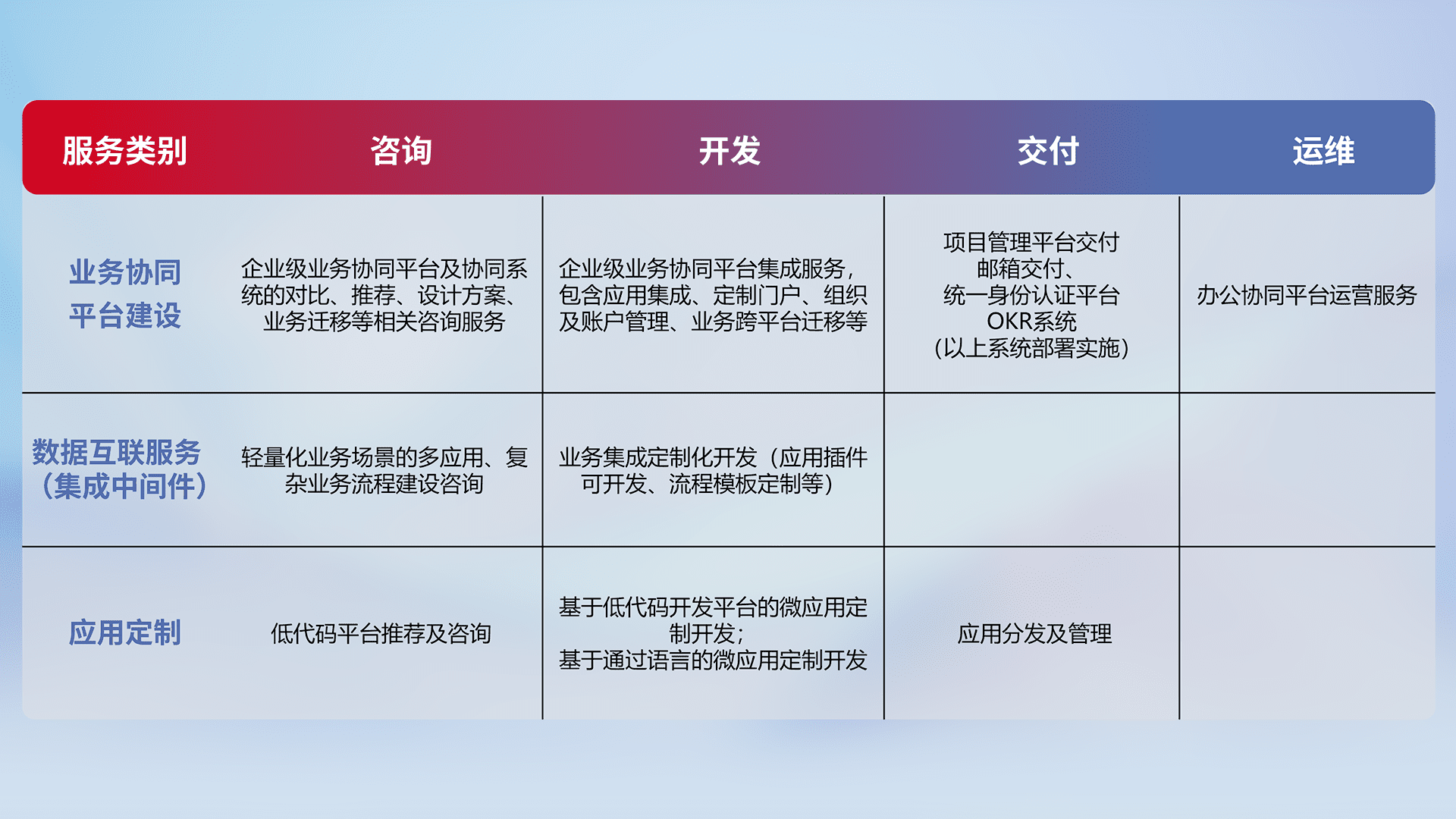 针对钉钉、、企微、、、IDaas等平台级产品提供产品的规划、、、、方案、、、、交付、、定制化开发等服务,,,实现如统一协同办公、、、、智能客户服务、、、、混合会议管理、、、、智能数据查询、、、等业务场景,,,,实现数字化转型。。。